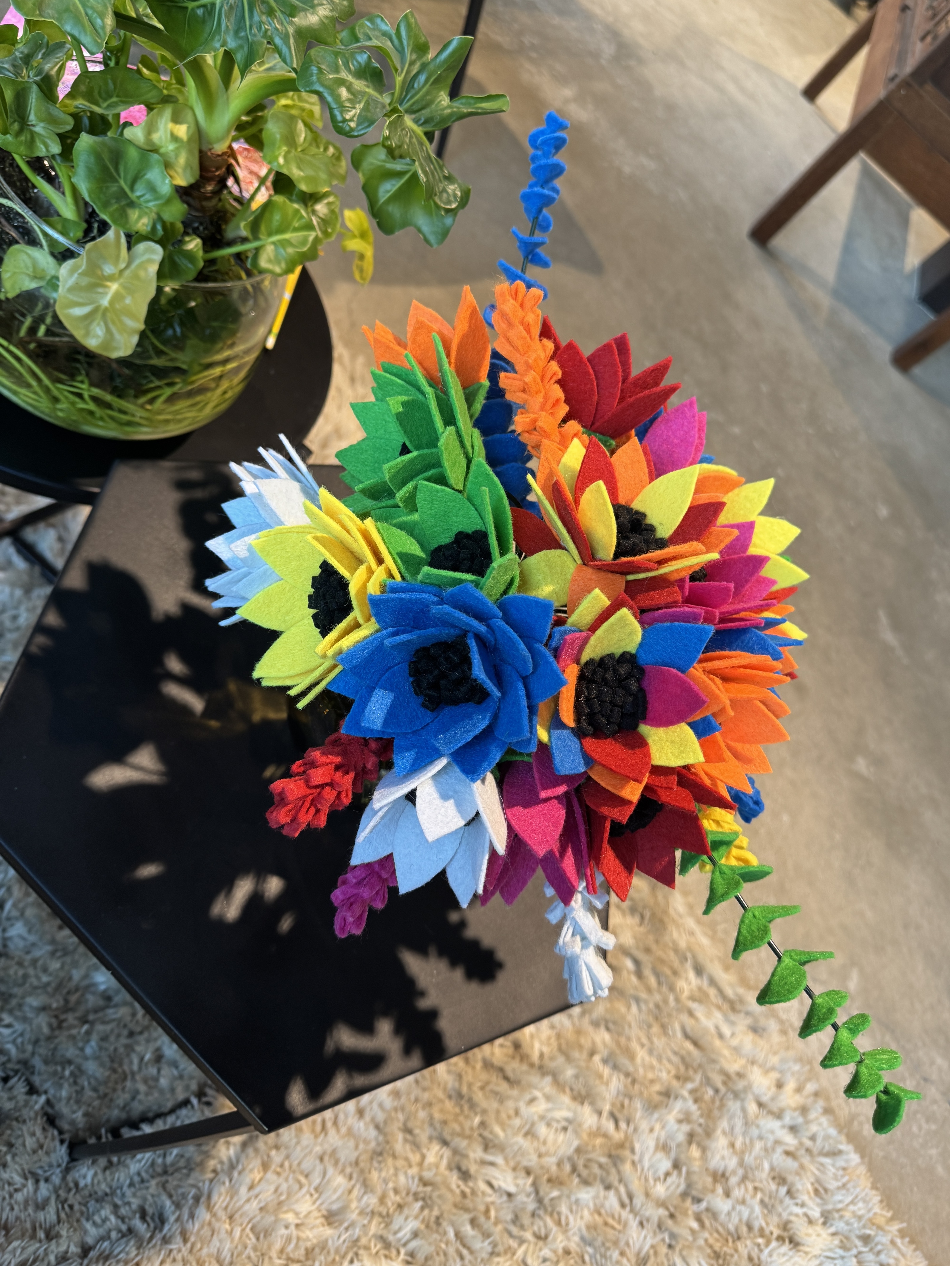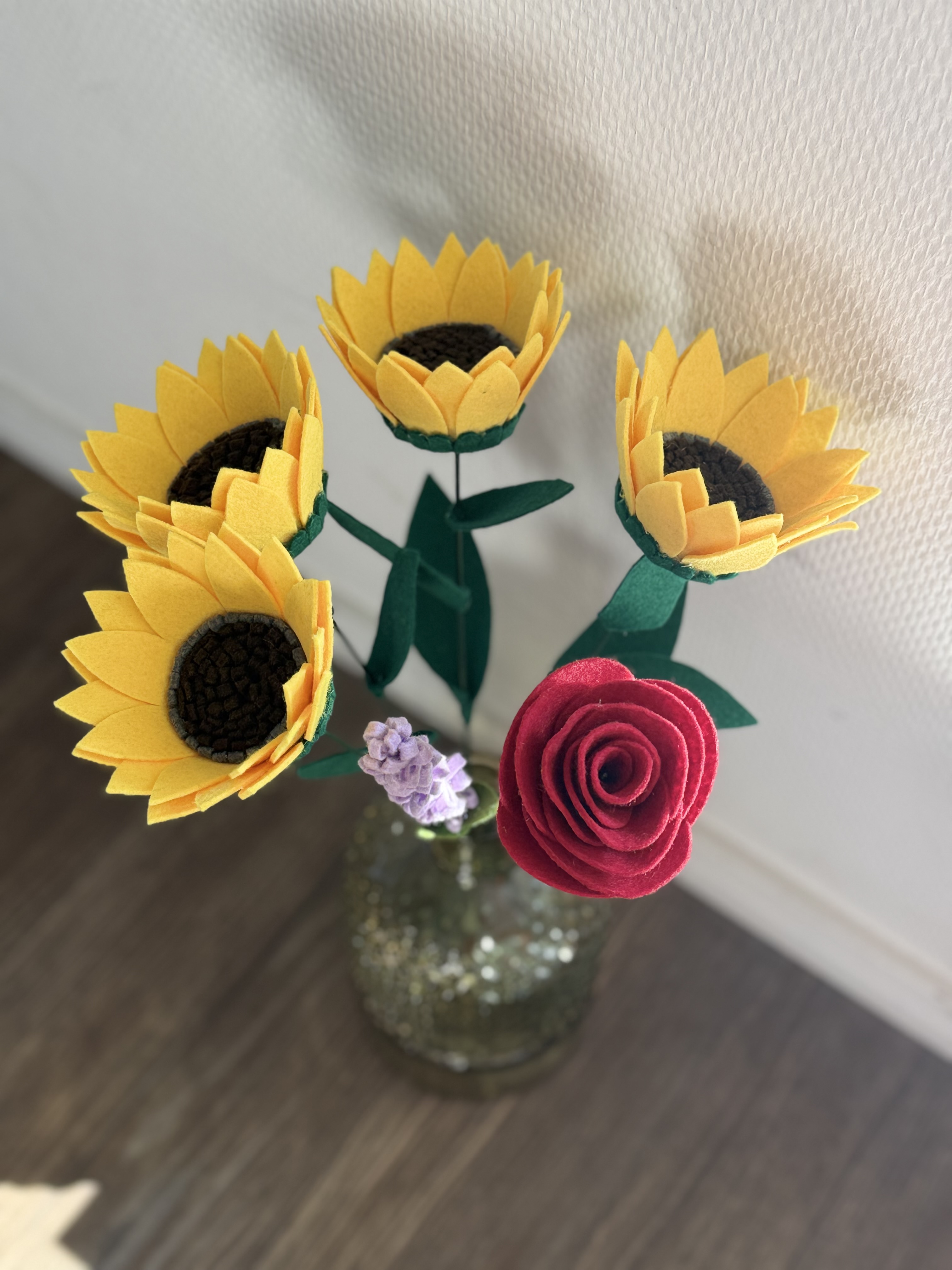 Ik maak in mijn vrije tijd als hobby viltbloemen, dit vind ik leuk om te doen en geeft mij ontspanning en energie. Lekker bezig zijn met bloemen bedenken en ontwerpen, vilt netjes knippen, en in elkaar lijmen. Elke viltbloem wordt zorgvuldig met de hand gemaakt. Ik word er steeds handiger in en de viltbloemen worden ook steeds mooier.